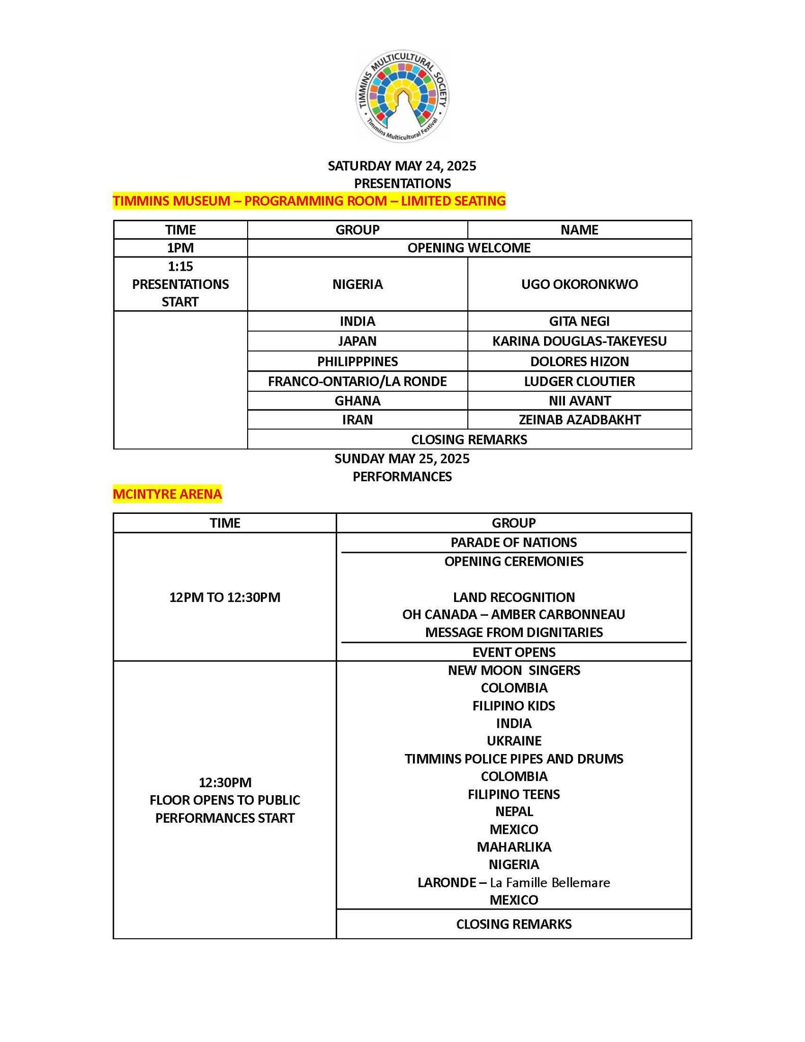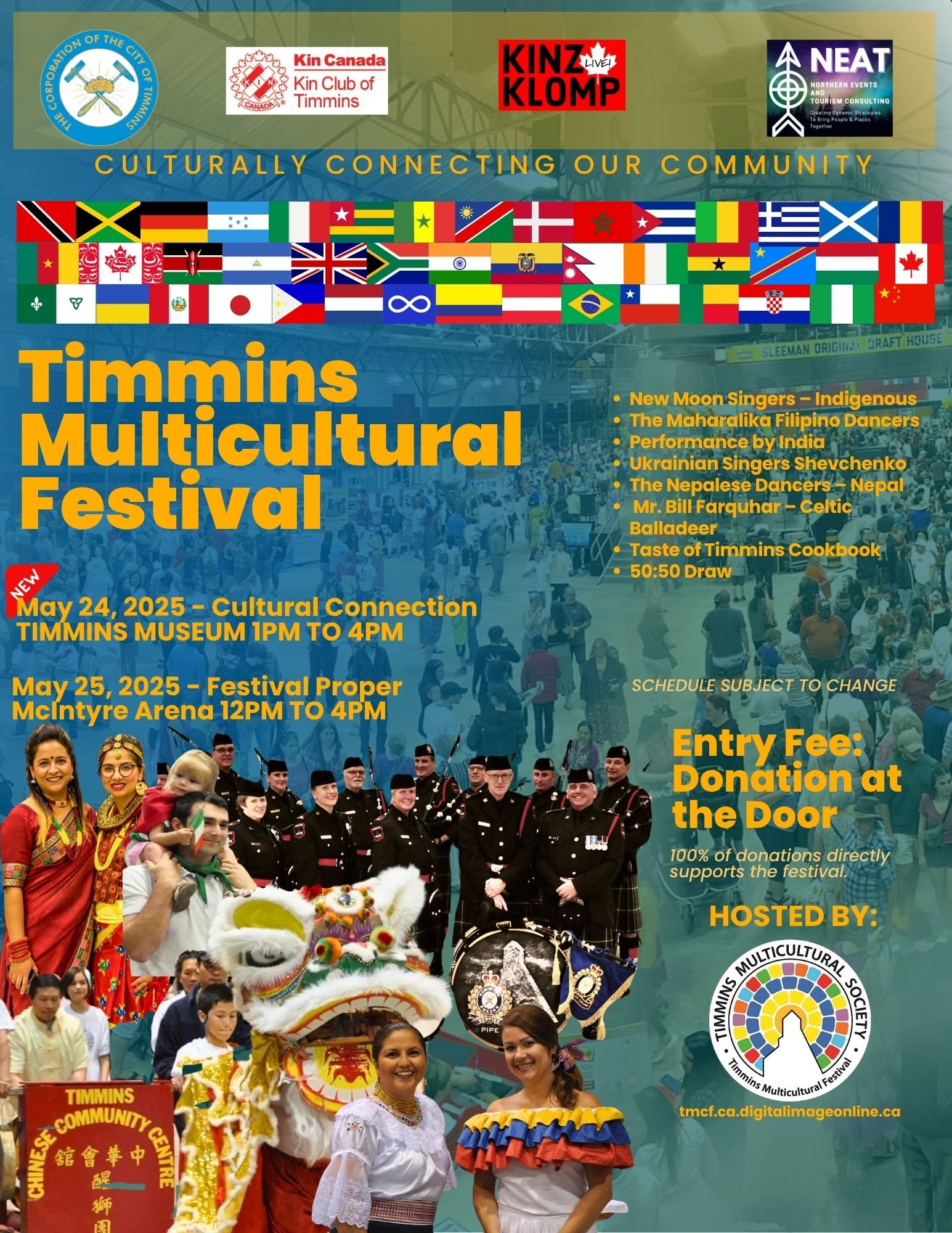 Timmins, ON – The Timmins Multicultural Society is excited to unveil the tentative schedule for the highly anticipated 53rd annual Timmins Multicultural Festival, a two-day celebration of the rich and diverse cultural tapestry of our community. This year’s event promises a vibrant showcase of dozens of nationalities through presentations, exhibits, music, food, and dance. We thank our sponsors, funders and supporters: